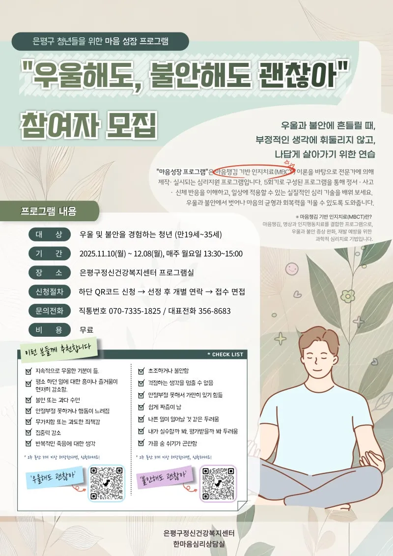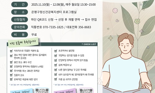 은평구 청년을 위한 마음성장프로그램 "마음챙김 기반 인지치료(MBCT) 제공"