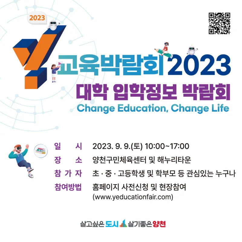 “ C h a n g e E d u c a t i o n , C h a n g e L i f e ” 2023. 9.7 (목) ~ 9.9 (토), 10:00 ~ 18:00 양천구청 일대 (양천공원, 구민체육센터, 해누리타운, 문화회관 등) 4차 산업혁명시대를 살아갈 미래인재 역량 강화를 위해 다양한 진로·진학 탐색의 기회 제공, 전문가 멘토와 기업을 섭외하여 청소년들의 맞춤형 미래교육 프로그램으로 구성하였습니다. 평생 학습 시대를 맞이하여 배움의 즐거움을 통해 풍요로운 인생을 꿈꾸는 기회를 제공하고자 합니다. 박람회 소개 프로그램 안...