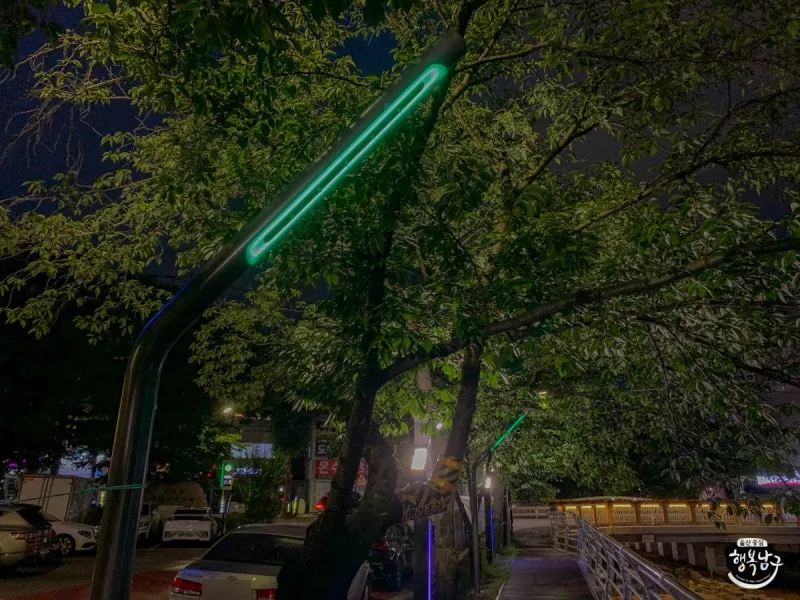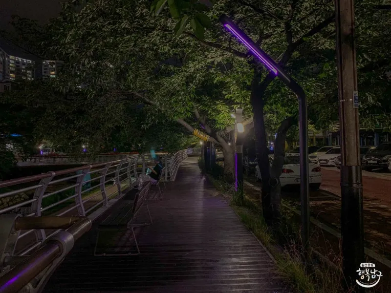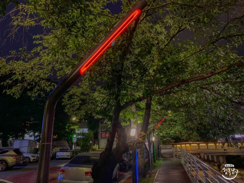 밤에 쿨링포그가 설치된 무거천에 다시 와봤습니다. 형형색색의 조명이 켜진 것이 보이는데요.