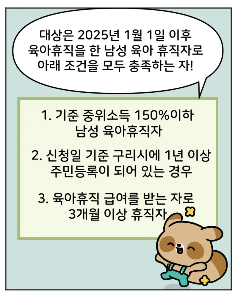 2025.1.1. 이후 육아휴직을 한 남성 육아휴직자 👇아래요건 모두 충족시 지원 |