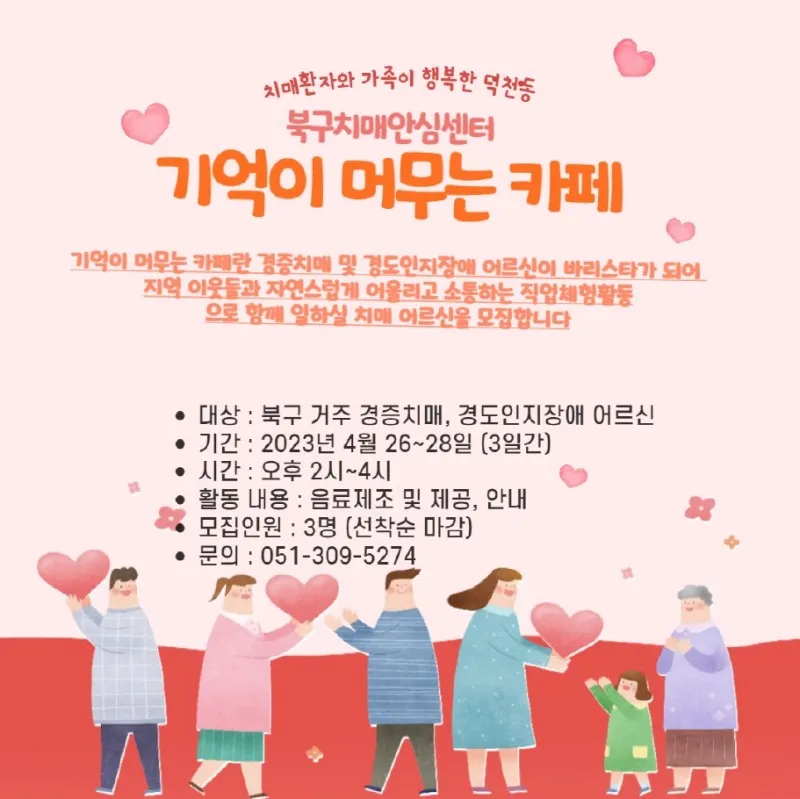 기타 자세한 문의는 치매안심센터 인식개선팀 051)309-5274로 연락 바랍니다.