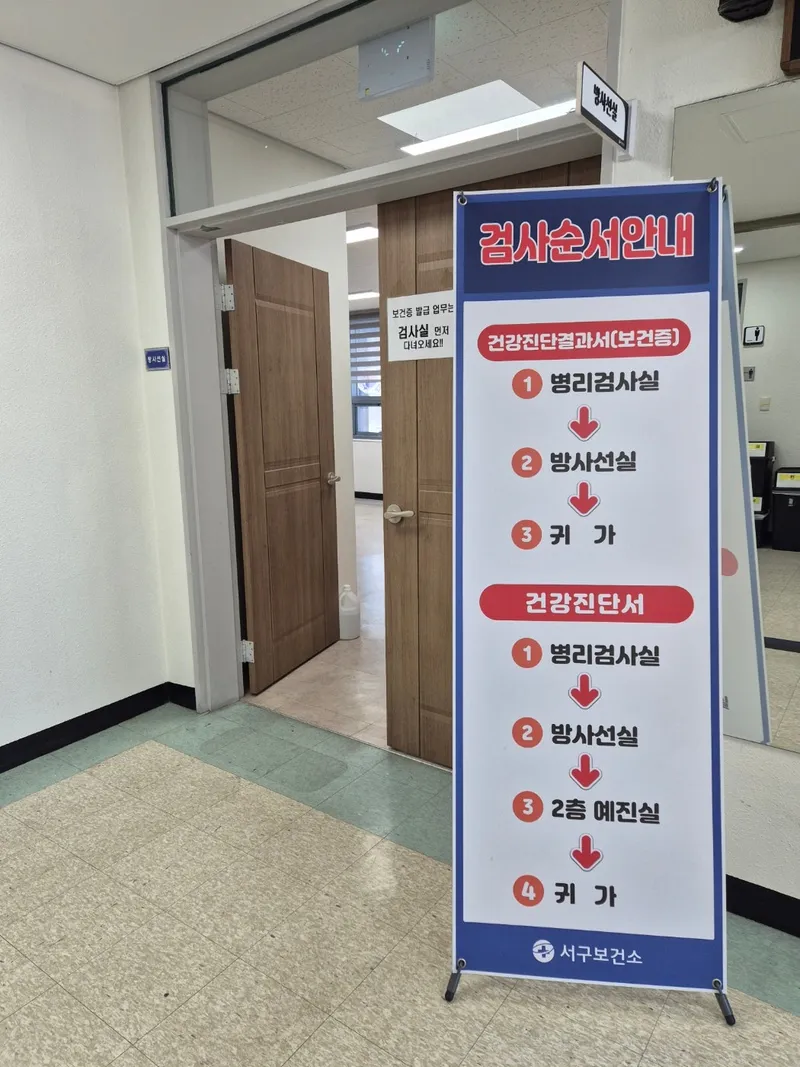 건강진단서의 검사순서는 병리 검사실> 방사선실> 2층 예진실에서 하고 귀가하면 됩니다.