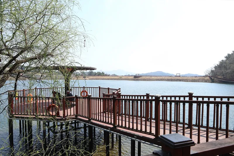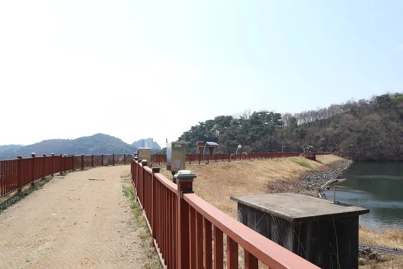난간이 설치 되어 있는 는 길에서 보는 저수지의 평온한 풍경이 아름다운 곳이다.