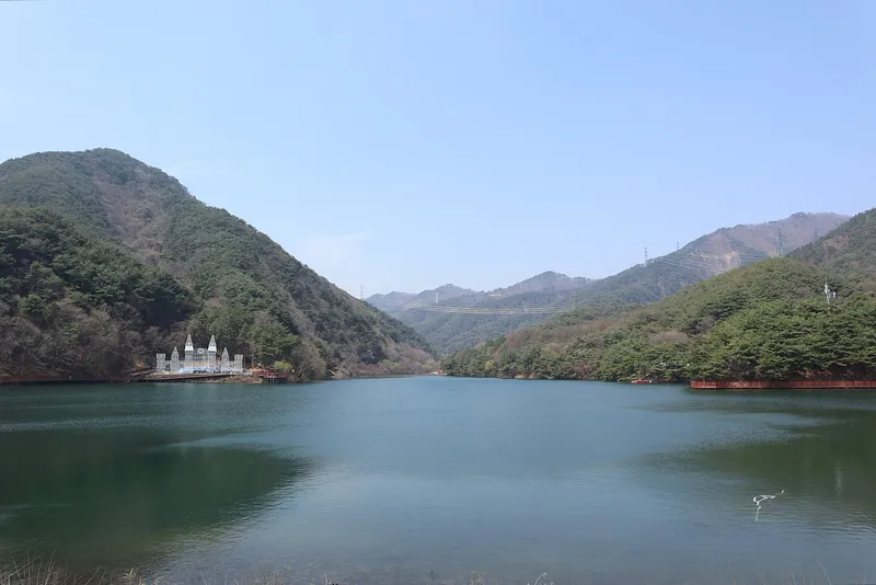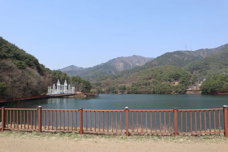 저수지가 마치 잔잔한 호수처럼 산에 둘러싸여 있는 모습이다. 그 가운데 하얀색 성 모양의 조망쉼터는 이곳에서 인생샷을 남기려고 하는 사람들의 핫플레이스로 떠오르는데 일조했다.