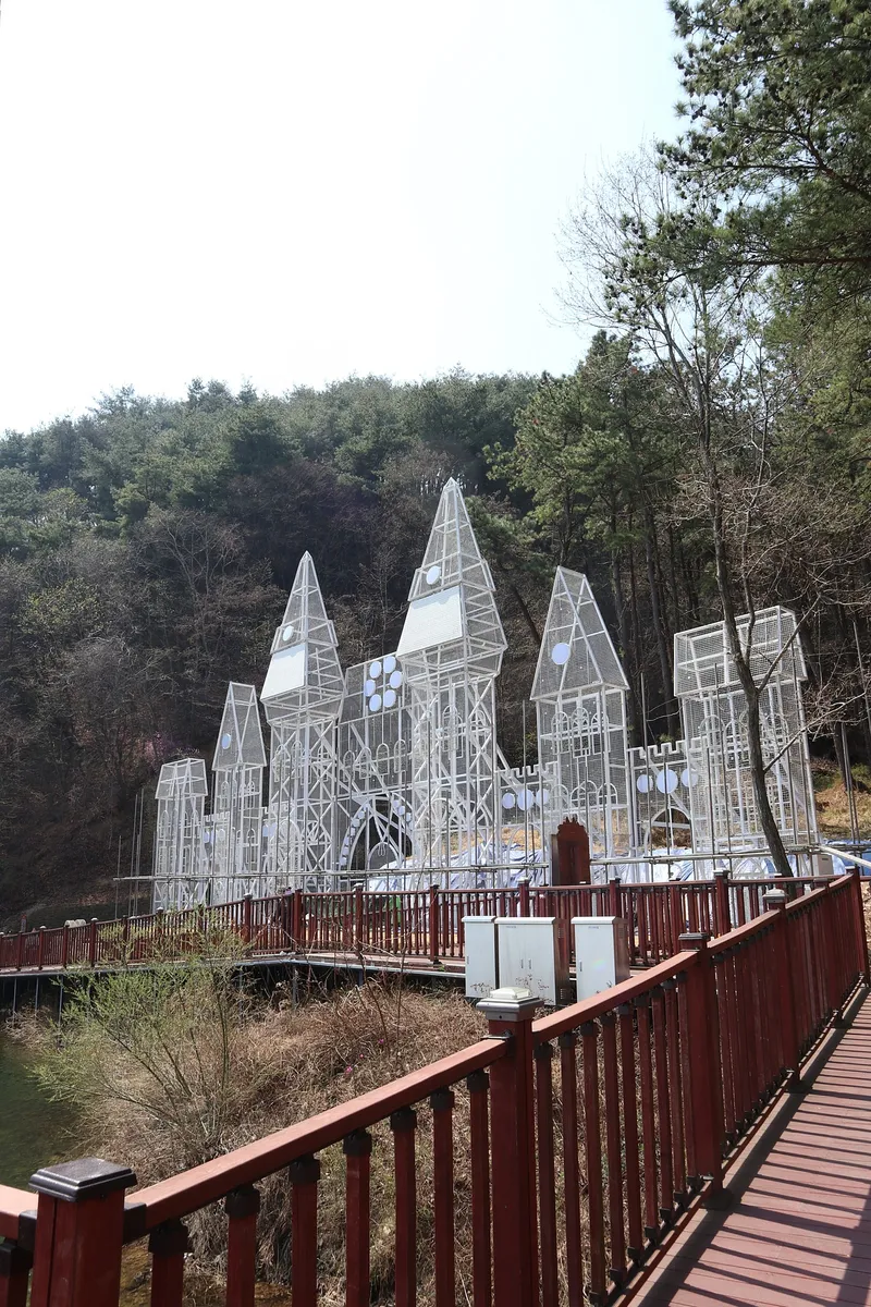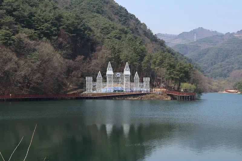 저녁이 되면 조명이 들어와서 색다른 분위기를 내는 구조물인데, 낮에는 잔잔한 저수지 풍경에 포인트가 된다.