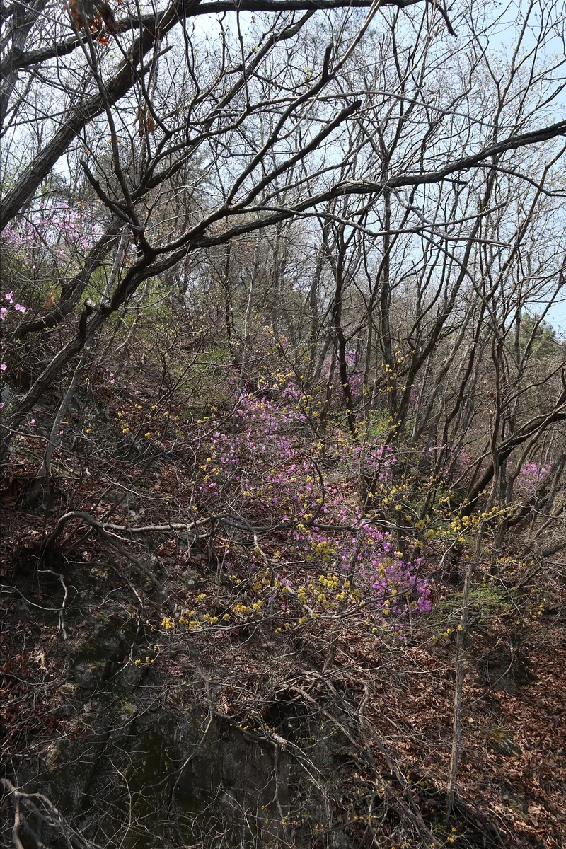 가는 길 데크 옆으로는 생강나무의 노란꽃과 분홍색 진달래꽃이 피어난 모습이 보인다.