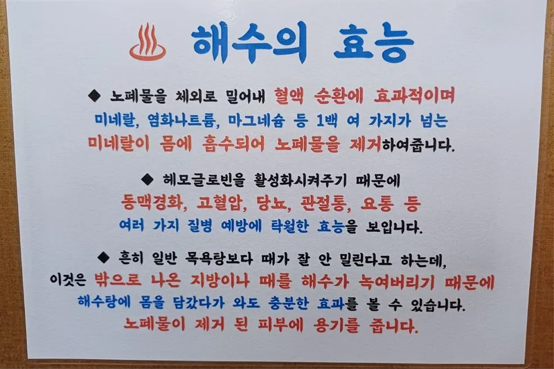 해수사우나는 바닷물을 40도 내외로 데워 목욕이나 찜질을 하는 것으로 해수의 효능으로는 바닷물에 녹아 있는 미네랄, 염화나트륨, 마그네슘등이 몸에 흡수되어 노폐물을 제거하여 준다고 합니다.