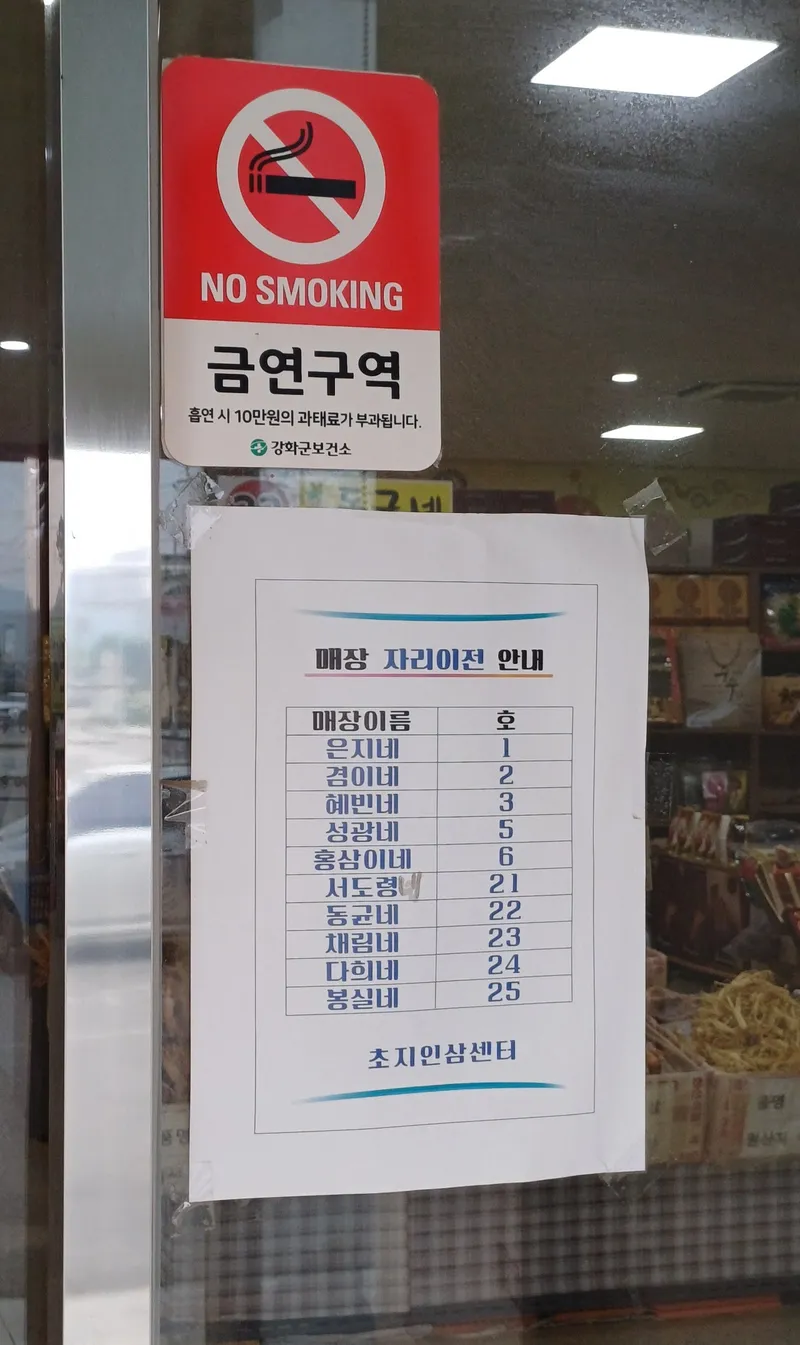 강화 초지인삼센타 입구입니다. 매장 이름들이 있습니다.