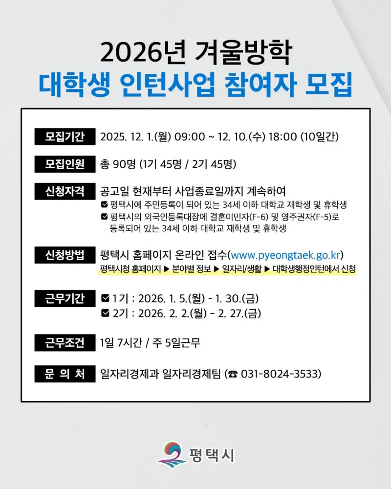 #평택 #평택시 #평택이 #대학생인턴 #겨울방학인턴 #인턴모집 #공공기관경험 #행정업무체험 #청년일자리 #행정인턴 #대학생인턴