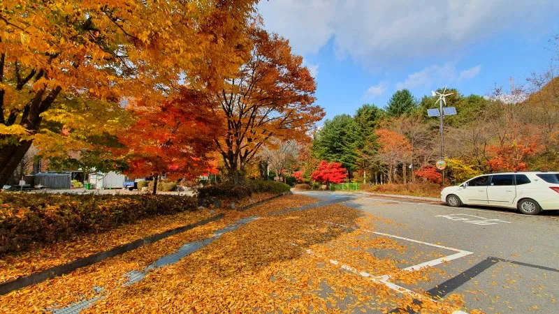 아래의 사진에서도 확인하실 수 있듯이 유명산자연휴양림 일대는 이미 주차장에서부터 완연한 가을 분위기가 절정을 찍고 있었어요. 단풍이 절정에 머무르는 시기를 맞춰 특정 장소를 방문한다는 것이 생각보다 쉬운 일은 아닌데, 금일 취재를 계기로 유명농계의 아름다운 가을절경을 담을 수 있겠다 싶어 내심 기대를 품고 계곡탐방길로 발걸음을 옮겨봤는데요. 저의 예상과 달리 유명농계의 단풍은 이제 막 낙엽이 지고 있었답니다. 아마 해당 글이 발행된 시점에 방문하신다면 붉은 단풍이 거의 떨어진 풍경을 마주하실 수 있으실 것으로 보이는데요. 유명산 계곡은 어비산과 유명산 사이에 자리한 골짜기로서 일조량이 낮고 계곡특성상 주변 온도가 낮기 때문에 단풍이 예상시기보다 일주일정도 일찍 찾아온다는 것을 이번 방문을 통해 알게 되었답니다. 만약 올해 단풍절경을 놓쳐버리셨다면 해당 내용을 잘 기억하셔서 내년에는 꼭 단풍을 구경하기 좋은 시점(10월 마지막주~11월 첫째주)에 방문하셔서 아름다운 가을날의 추억을 만들어보시길 바랄께요(유명농계 외 지역은 11월 둘째주까지 단풍구경이 가능합니다)