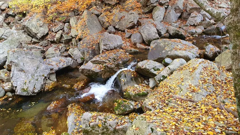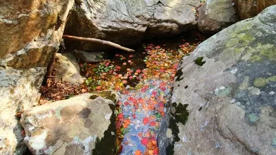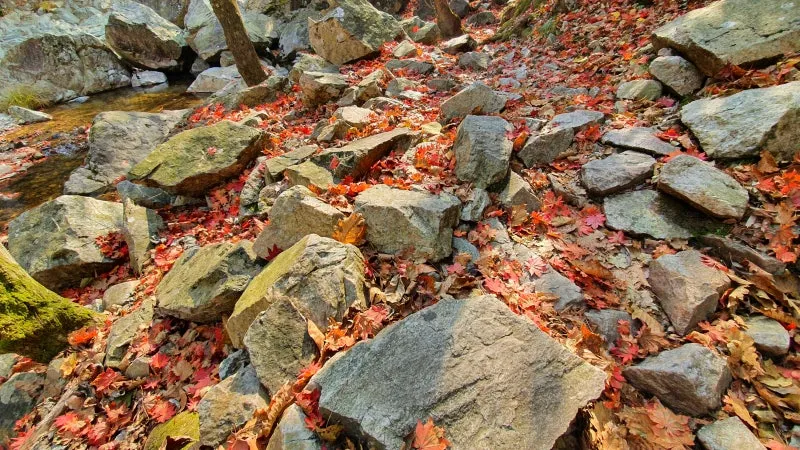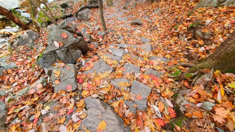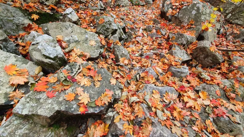 유명계곡은 골짜기라는 지리적 특성때문에 다른 곳보다 일찍 단풍이 시작되지만, 최근에 갑작스레 추워진 날씨와 더불어 경기북부지역에 내린 가을비 때문인지 유명농계의 단풍은 거의 반 이상이 사라진 상태였답니다. 주차장이랑 그렇게 멀리 떨어져있는 곳도 아닌데 확연하게 다른 가을 풍경에 살짝 난감하기도 했지만 그래도 가을의 중심에 서있다는 느낌이 들 정도로 곳곳에서 화사하고도 아름다운 단풍을 구경할 수 있었어요. 무엇보다 이날 여행이 다른 장소들보다 더욱 기억에 남을 수 있었던 것은 바로 바닥에 흩뿌려진 단풍잎들 때문이었는데요. 탐방로와 계곡 등지에 수북하게 쌓인 낙엽들은 정말 생각지도 못했던 '뜻밖에 풍경'들로서 이는 올해 발견한 최고의 가을풍경이 아닐까 싶을 정도로 환상적이었답니다