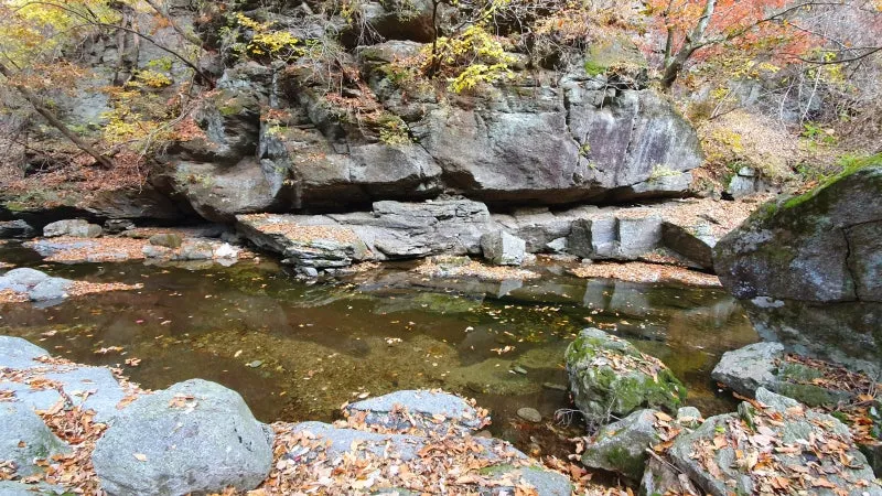 유명농계 트래킹 코스를 따라 조금 더 깊숙한 곳으로 들어가면, 앞서 일찍 떨어진 낙엽에 대한 아쉬움을 달래고도 남을 아름다운 진풍경이 펼쳐지는데요, 특히 초록색으로 페인트칠 된 철제 다리가 나오는 구간부터는 유명산의 암벽과 더불어 주변의 수목과 계곡이 어우러지는 풍경이 다른 곳보다 월등히 빼어나기에 마치 설악산에 방문한 듯한 착각이 들 정도랍니다. 무엇보다 해당 구간부터 마당소, 박쥐소라 불리우는 유명농계의 신비로운 소(沼)들을 순차적으로 만나보실 수 있어 계곡트래킹이 더욱 즐거워지는데요. 참고로 유명농계 트래킹코스 종점(유명산 정상으로 향하는 갈림길)까지는 편도 30-40분이 소요되오니 방문에 참고하시길 바라며, 이상 유명농계의 10월 말 11월초 단풍소식을 모두 마치도록 하겠습니다. 장소 또는 내용과 관련하여 궁금한 점이 있으신 분들은 댓글로 문의부탁드려요
