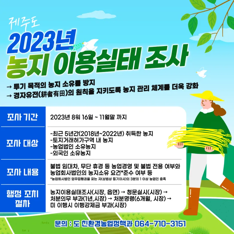 제주특별자치도는 8월 16일부터 11월 말까지 '2023년 농지 이용 실태조사'를 추진합니다.