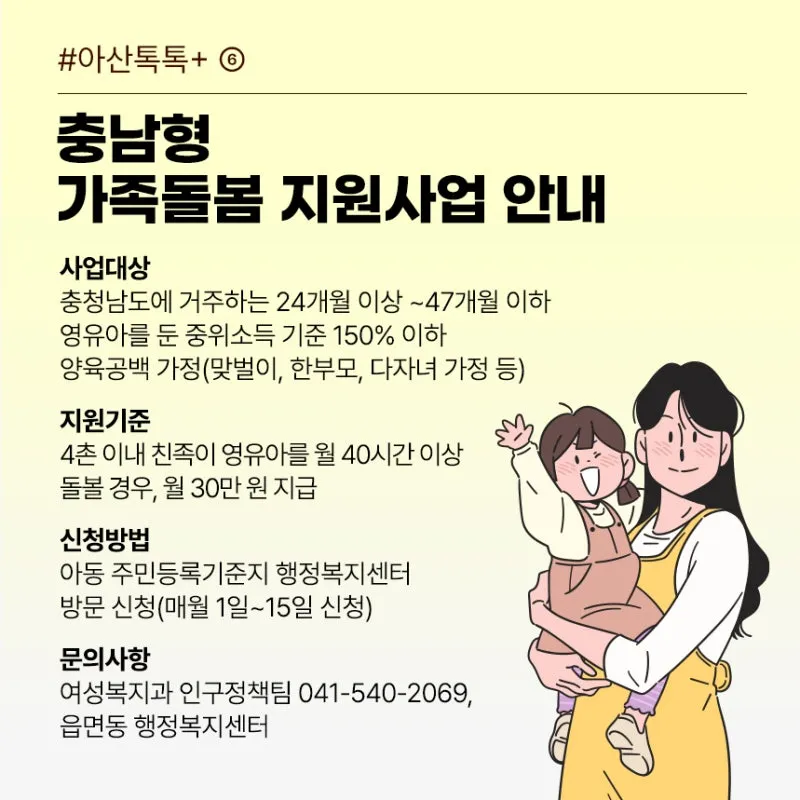 문의사항 : 여성복지과 인구정책팀(041-540-2069), 읍면동 행정복지센터