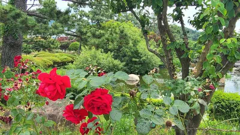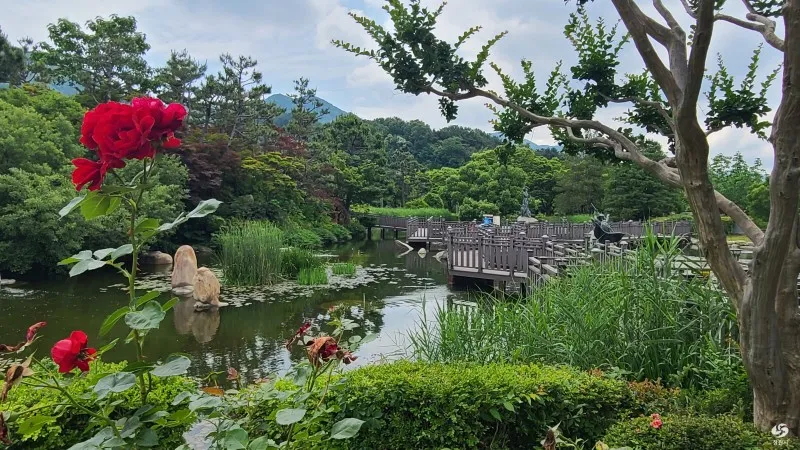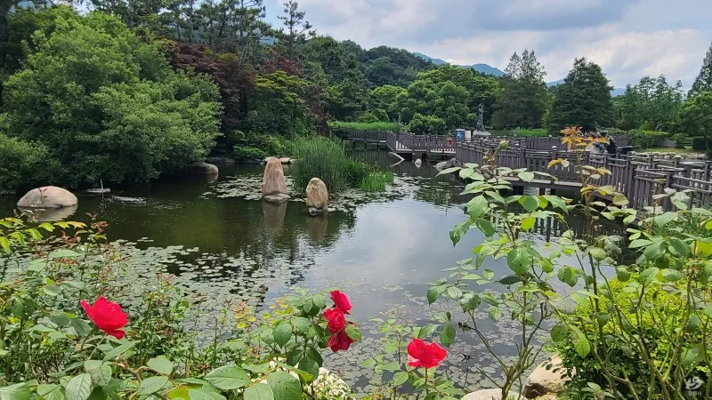 장미꽃이 강렬하게 피어 있는 사이로 경상남도정원의 연못이 있는 나무데크길로 걸어 가는데 숲에 와 있는 착각이 들 정도로 녹음이 짙습니다.