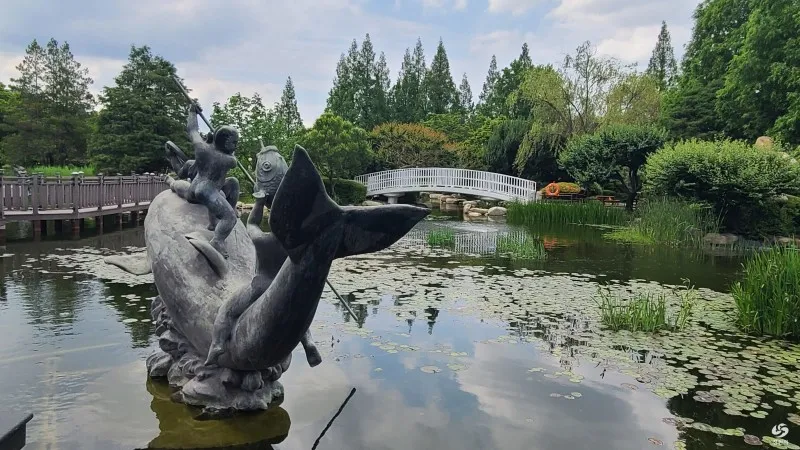 연못위로 고래등에서 놀고 있는 어린아이의 조형물은 고래분수로 자리를 잘 잡고 있는곳은 진양호 위치라고 합니다.