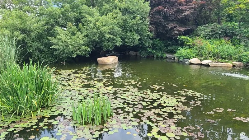 연못위에는 수련아래로 비단잉어가 헤엄치는 모습이 보입니다.
