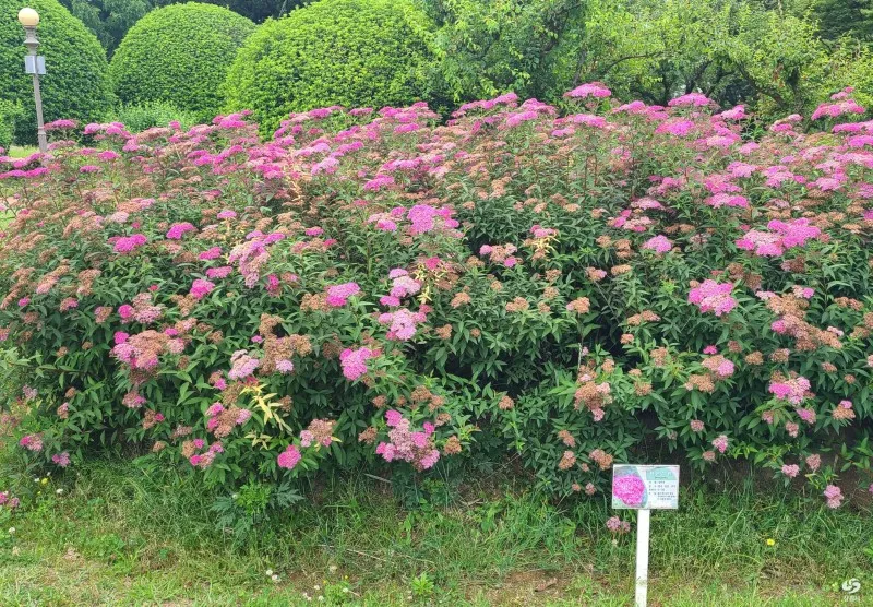 아직 피지 않은 연꽃 대신에 핑크색 작은 꽃잎송이가 수국처럼 보이는 붉은조팝나무꽃이 흐드러지게 피어 연못가를 장식합니다.