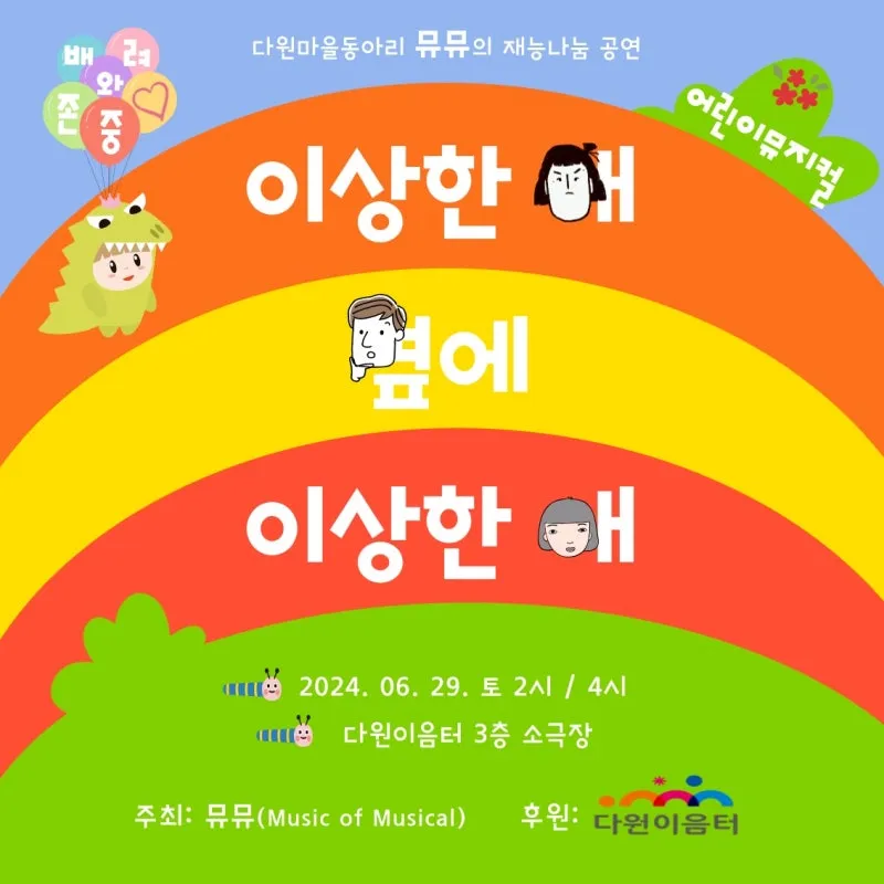 6월에 현대의 어린이들은 배려와 존중이 필요하다는 주제로 다원이음터 소극장에서 어린이 뮤지컬 <이상한 애 옆에 이상한 애>를 공연했어요. LED 퍼포먼스를 하는 동안 아이들의 웃음이 끊이지 않는 것을 들었을 때, ‘이 맛에 하는구나!’ 싶어 행복했어요.