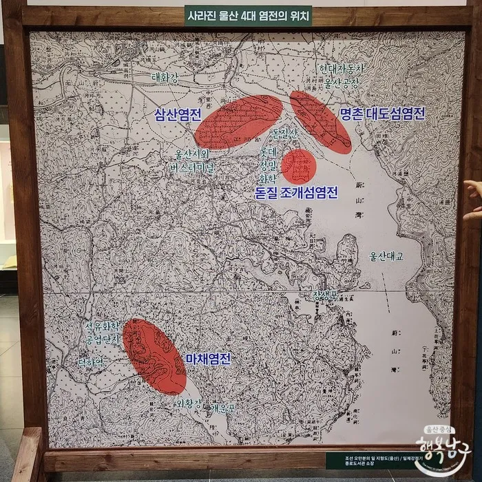현재는 사라졌지만 울산의 4대 염전은 마채염전, 돋질 조개섬염전, 삼산염전, 명촌 대도섬염전이 있었다고 합니다.
