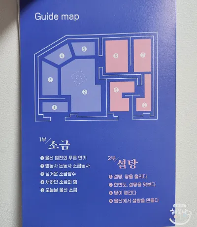 전시 가이드맵은 1부 소금의 이야기 5개 주제와 2부 설탕의 이야기 4개의 주제로 나누어져 있었습니다.