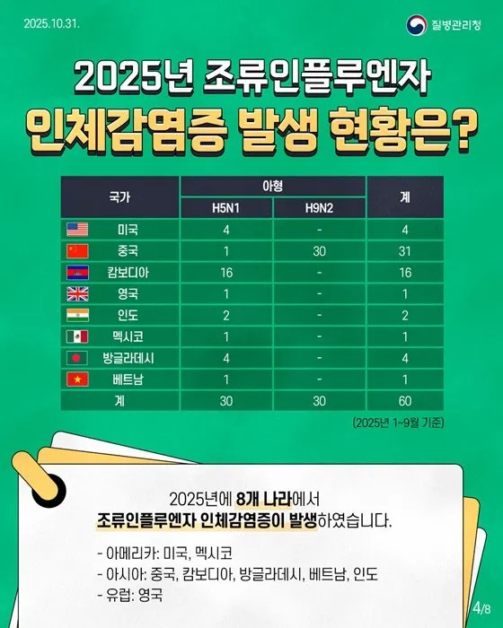2025년에 8개 나라에서 조류인플루엔자 인체감염증이 발생하였습니다.