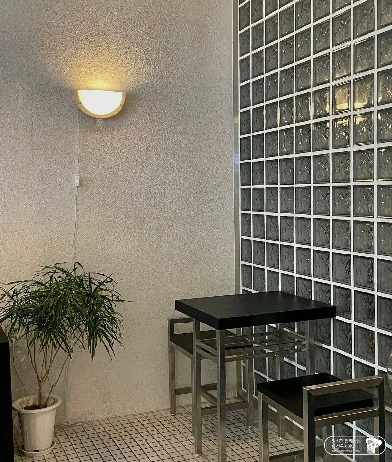 은은한 조명과 식물들이 잘 어우러진 실내예요. 그리 넓지는 않지만 한 쪽에는 흰색 타일이 깔린 모던한 분위기라면 반대편에는 카펫 재질의 바닥이라서 색다른 분위기를 모두 즐길 수 있어요. 모던미드센추리 인테리어를 활용한 가구들과 무채색상의 조화가 편안한 분위기가 나더라고요.