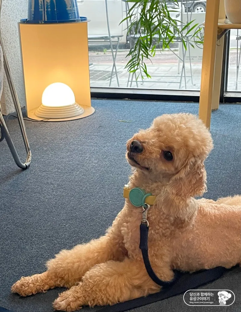 놓여 있던 핸드폰을 들어 사진을 찍을 수밖에 없게 만드는 사랑스러운 강아지, 땅콩이도 볼 수 있어요. 간간이 매장을 방문한다고 해요. 제가 방문했던 이날에는 저녁 이후에 방문한 땅콩이를 만날 수 있었어요. 그림자부터 귀여움이 뚝뚝 떨어지는 아이입니다. 저도 윅스커피 방문할 때는 땅콩이를 볼 수 있을까 고대하며 방문하고 있어요.