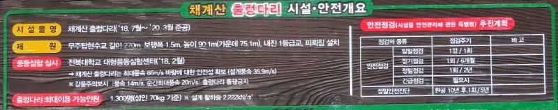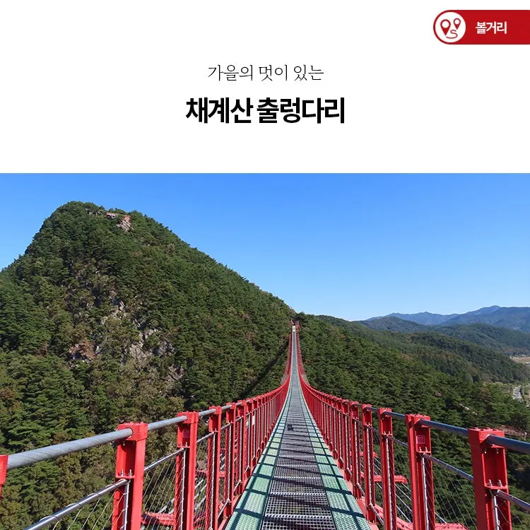 채계산 출렁다리는 국도 24호선을 사이에 두고 적성 채계산과 동계 채계산을 잇는 다리입니다. 2020년 3월 두 산등성이를 잇는 채계산 출렁다리가 탄생했다. 높이 75.1~90.1m에 길이 270m로, 다리 기둥이 없는 무주 탑 산악 현수교로 국내 두 번째로 긴 다리입니다.