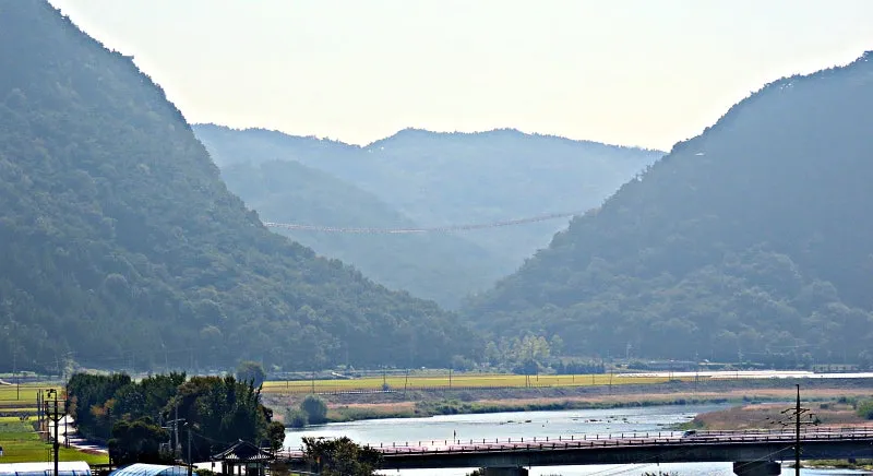순창군 적성면 평남길 구남마을 섬진강 미술관에서 바라본 두 개의 채계산(동계 채계산-왼쪽 / 적성 채계산-오른쪽)과 두 개의 채계산을 잇는 출렁다리의 모습입니다.