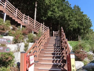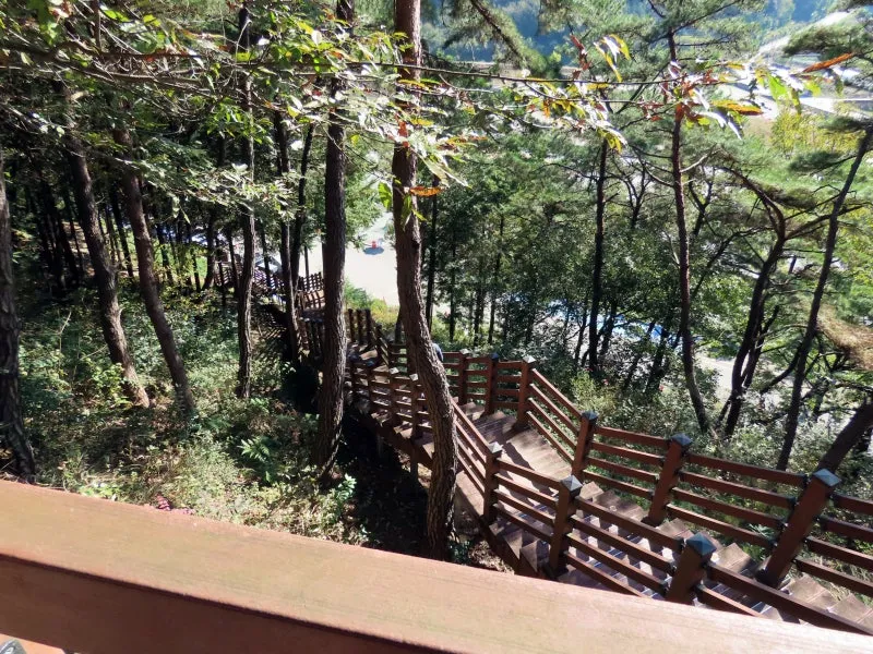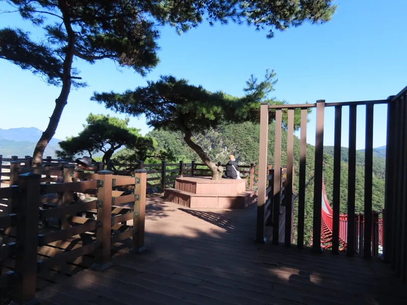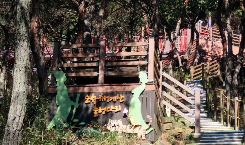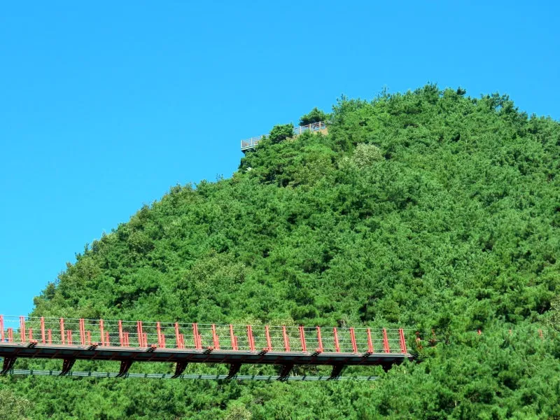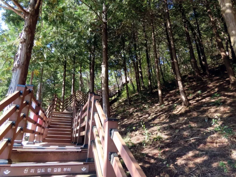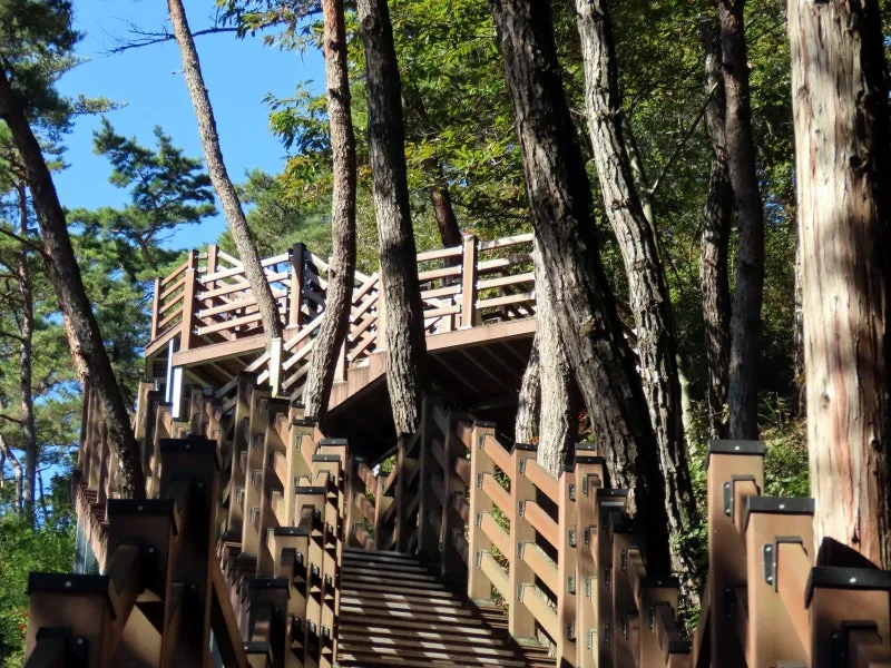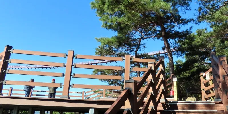출렁다리까지 데크 계단을 이용하시게 되는데 조금 급경사라 조심스레 올라가시는 것을 권합니다. 계단 주위 산에는 편백나무가 있어서 숲에서 나오는 피톤치드로 산림욕을 즐기실 수 있습니다. 입구에서 한 200m 터쯤에 전망대가 있습니다.