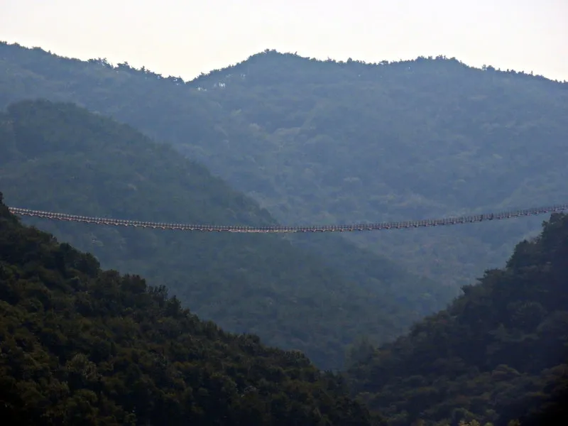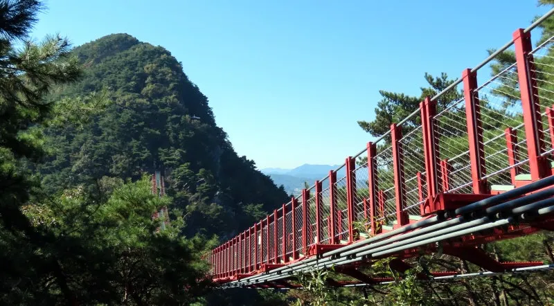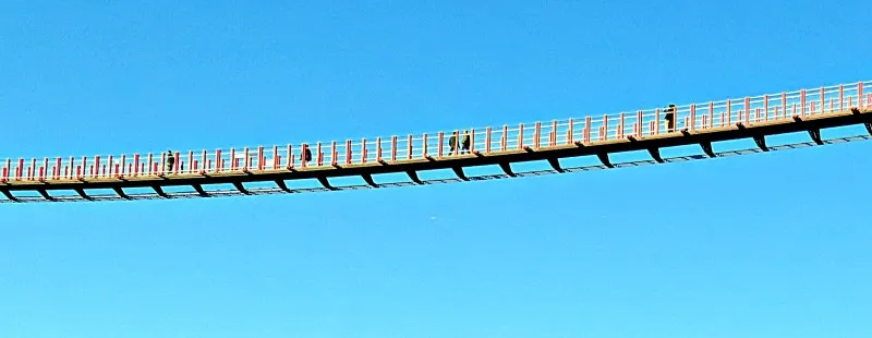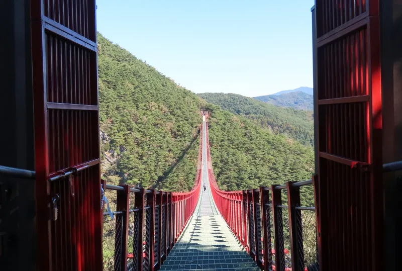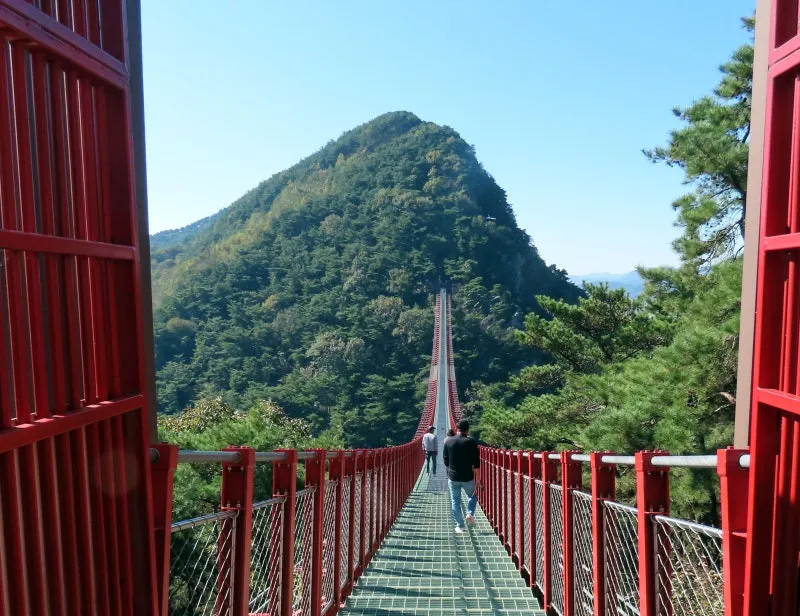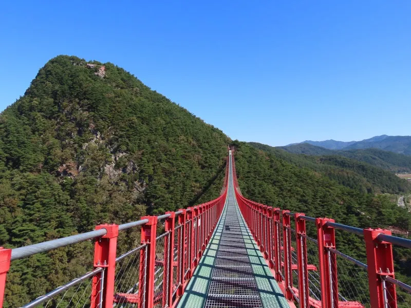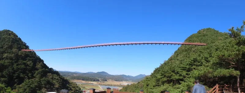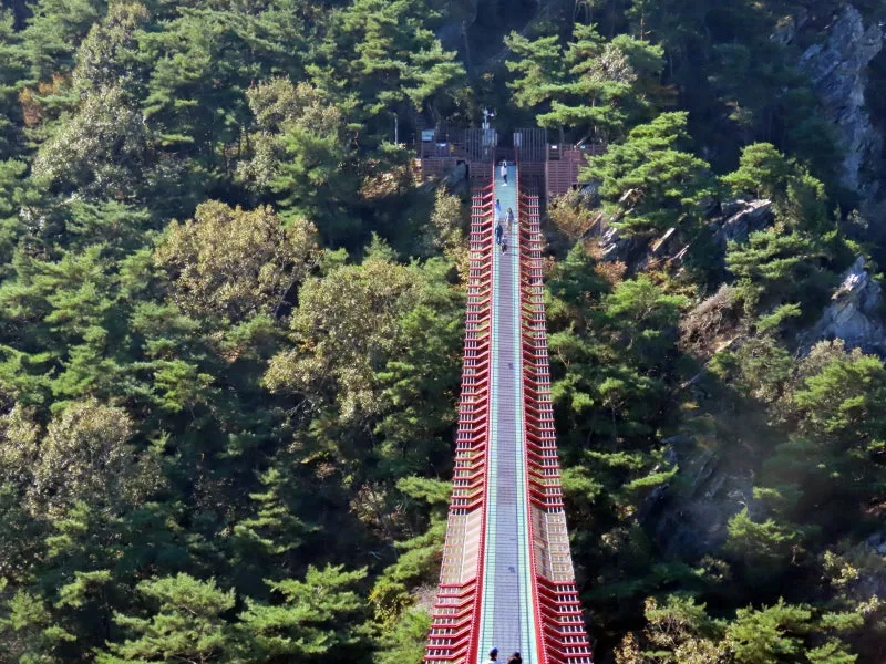 첫 번째 전망대에서 본 출렁다리의 위용입니다. 출렁다리는 길이 270m이고 높이는 90~75m입니다. 등산객들이 다리를 넘어가는 모습도 가까이 보이네요.