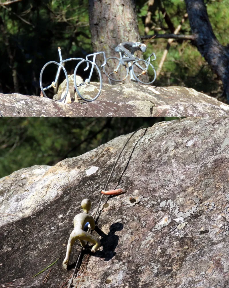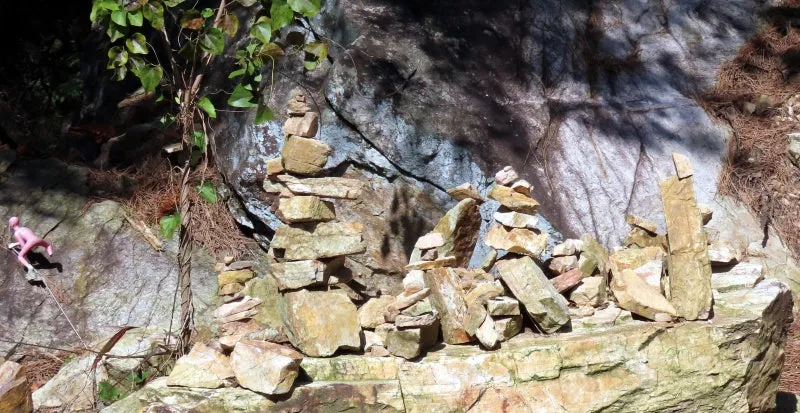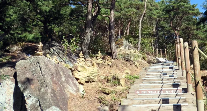 첫 번째 전망대에서 한 100m 정도 더 올라가시면 출렁다리에 도착합니다. 올라가시는 중간중간이 무료함을 달래기 위해 누군가 만든 소박한 돌탑과 앙증맞은 장식품이 피곤을 잠시 잊게 합니다.