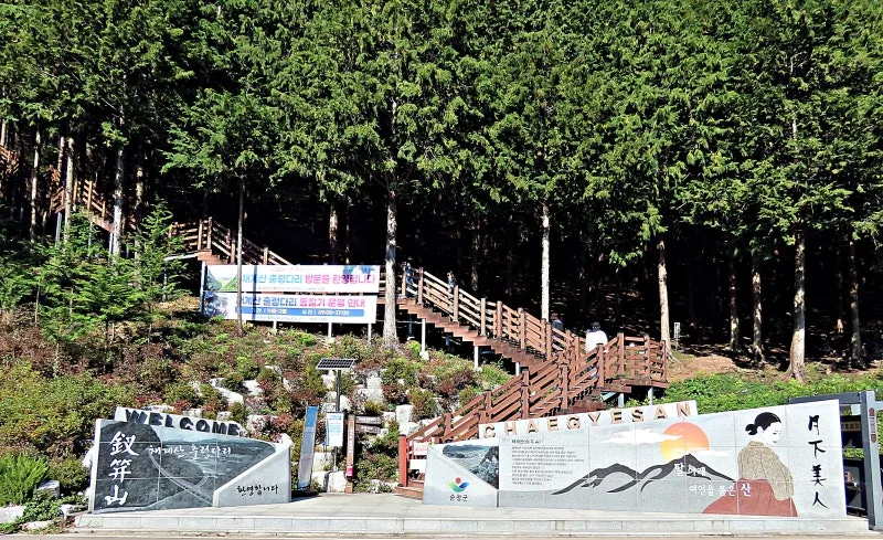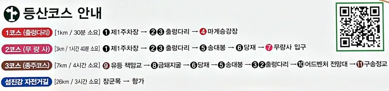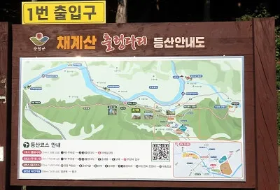 채계산 등산코스는 3코스로 (1) 출렁다리를 넘는 단순코스-1KM, (2) 출렁다리를 넘어 송대봉을 지나 무량사 입구 -3KM, (3) 3개의 면을 지나는 최장 코스로 유등 책암교에서 시작해서 적상면 채계산으로 해서 동계 구송정교까지 가는 7KM 코스가 있습니다.