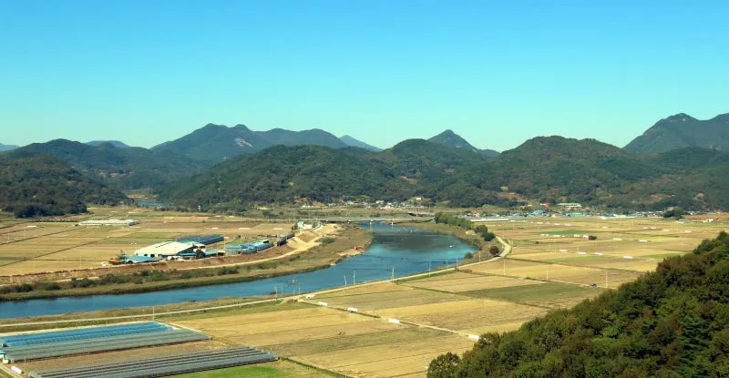 출렁다리 건너면서 오른쪽을 보시면 최고의 풍경이 펼쳐집니다. 적성면 늦가을 들녘에 유유히 흐르는 섬진강, 저 멀리 보이는 회문산, 용궐산…. 넉넉한 시골 평야의 모습입니다.