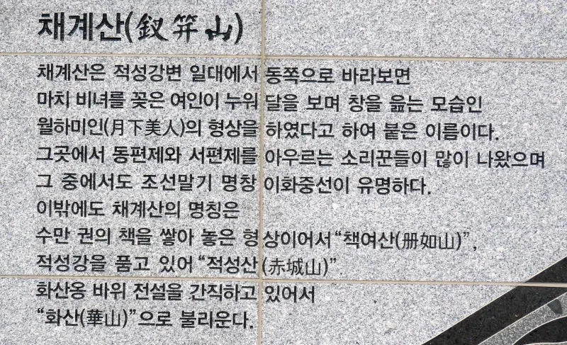 순창의 3대 명산 채계산( 책여산)은 섬진강 변에 마치 수만 권의 책을 켜켜이 쌓아 놓은 형상을 닮아 붙은 이름이라 합니다. 채계산은 적성산이라고도 불리는데 적성 강변 임동마을 매미 터에서 보면, 산이 비녀를 꽂은 여인이 누워 달을 보며 창을 읊는 모습(월하미인)과 닮았다고 적성산이라고도 합니다.