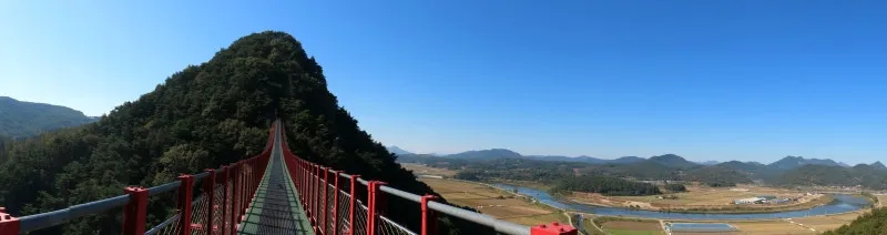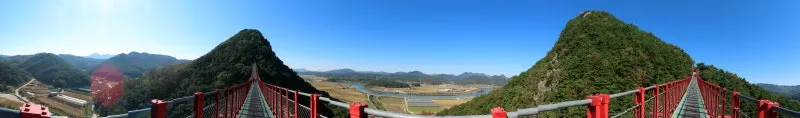 출렁다리 중간에서 360도 돌면서 찍은 파노라마 사진입니다. 왼쪽이 적성 체계산, 중간이 적성면 들녘, 오른쪽이 동계 채계산입니다. 실제로 보시면 와~~하는 소리가 절로 납니다. 이것을 보기 위해 출렁다리에 왔다고 생각됩니다.