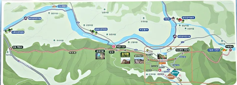 오늘은 단순 코스인 출렁다리를 건너보는 코스를 안내하겠습니다. 쉬지 않고 걷는다면 30분짜리 단순 코스이지만 산이 급경사로 그리 만만하지 않은 코스입니다. 그리고 출렁다리 위에서 보는 아찔함과 뻥 뚫린 적성면 일대 들녘의 모습에 매료될 것입니다.