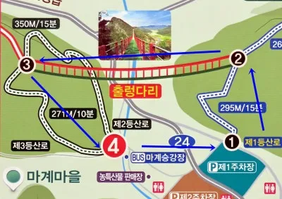 제1 주차장 출렁다리 입구에서 295m 올라가시면 출렁다리에 도착합니다.