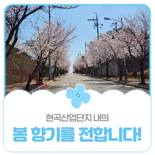 사람 많은 벚꽃길도 예쁘지만 조용하게 걷다 가기에 좋은 벚꽃길을 추천해 보고 싶었습니다. 벚꽃이 떨어지기 전에 현곡산업단지 내의 벚꽃길을 걸어보시는 건 어떤가요?