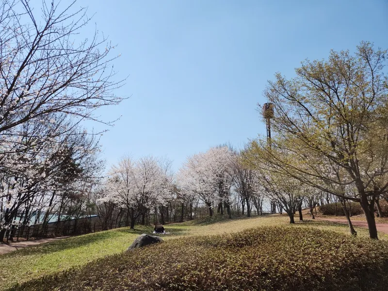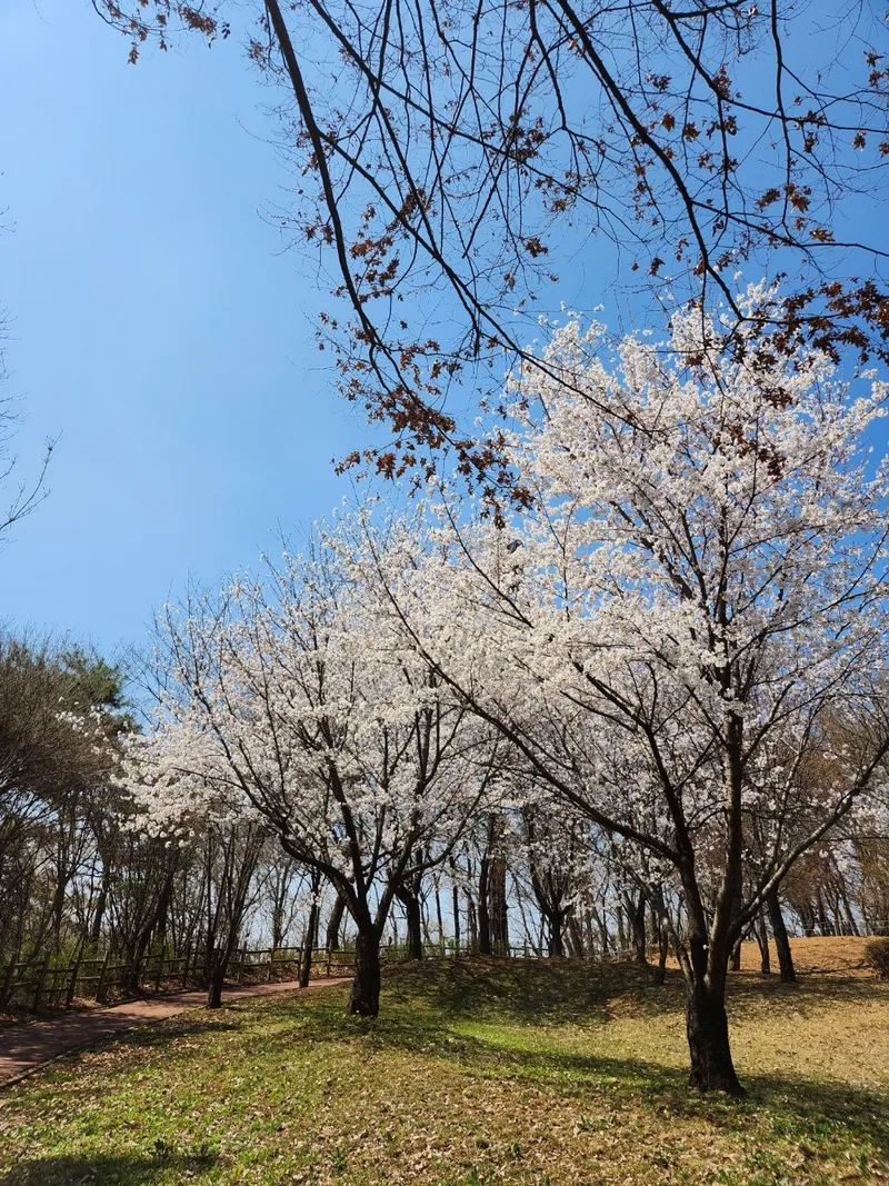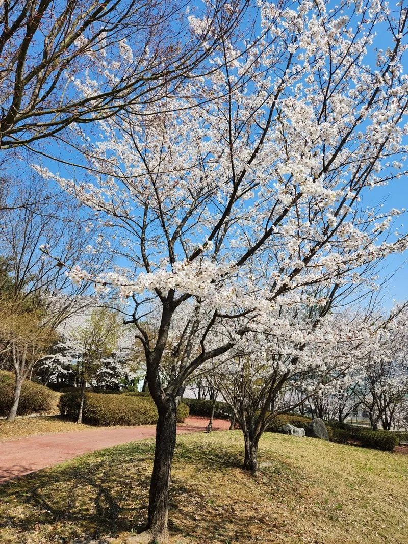 현곡근린공원이 보입니다. 공원 쪽의 벚꽃나무가 저에게 손짓을 하는 것 같습니다. 그곳으로 올라가 봅니다. 초록 잎나무 사이의 벚꽃을 바라봅니다. 봄 향기를 맡으며 공원을 걸어봅니다. 가지마다 벚꽃의 모습이 제각각이지만 함께 있음으로써 더욱 예뻐 보이는 것 같습니다.