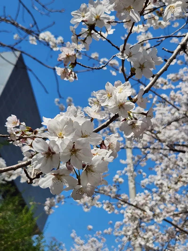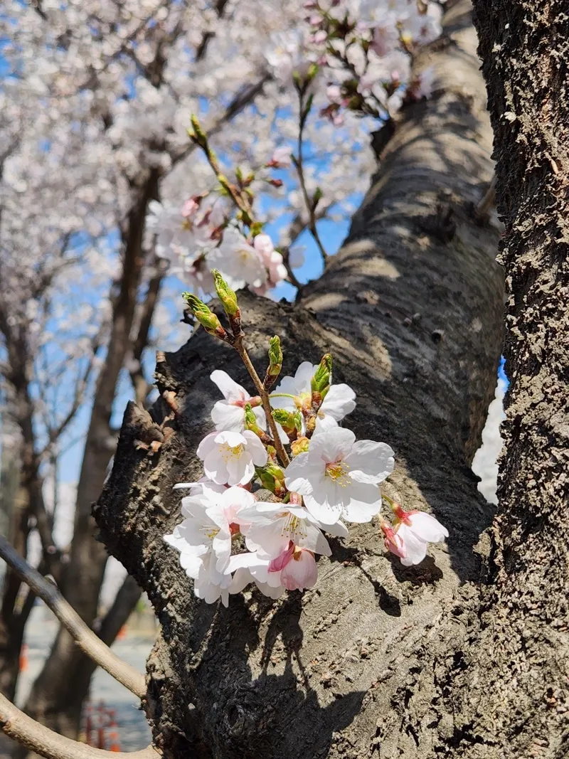 천천히 걸으면 벚꽃을 봅니다. 예쁘다는 말이 절로 나옵니다. 햇빛이 진한 덕분인지 벚꽃이 더욱 뚜렷하게 보입니다. 여기를 봐도 예쁘고 저기를 봐도 예쁩니다.