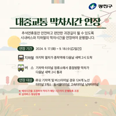 9. 17.~9. 18. 2일간 대중교통 막차시간이 연장됩니다.