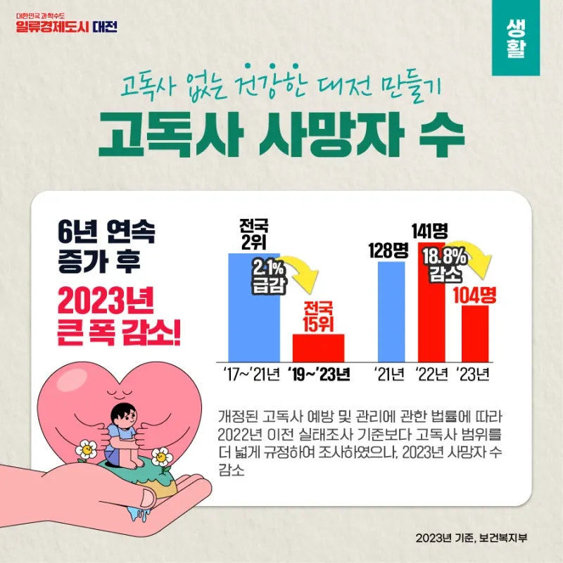 대전지역 고독사 사망자 수가 크게 감소한 것으로 조사됐습니다. 보건복지부가 지난 10월 17일 발표한 ‘2024 고독사 사망자 실태조사 결과 발표’에 따르면 2017년부터 2022년까지 6년 연속 증가 후 2023년 큰 폭으로 감소했는데요, 2023년의 경우 2021년 보다 18.8% 감소한 것으로 나타났습니다.
