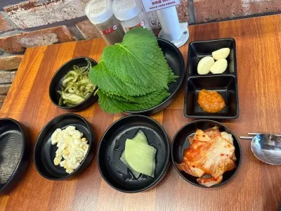 주문하니 김치와 쌈채소, 소스와 마늘, 샐러드까지 알차게 나오네요.