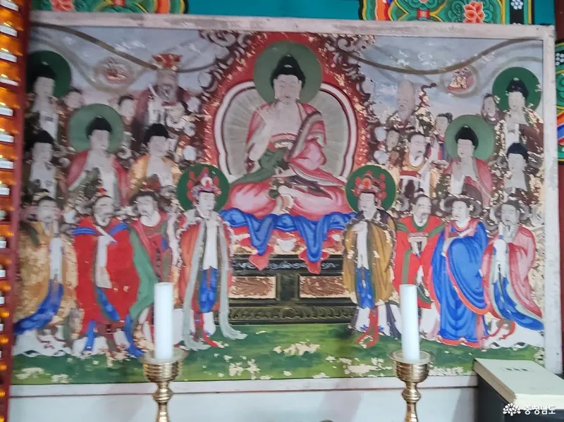 삼존불 뒤로 걸린 후불탱화는 ‘영산회상도’입니다. 가운데 석가모니불을 중심으로 좌우에 문수보살과 보현보살 등 6대 보살이 협시하고, 상단 뒤편에 마하가섭존자와 아난존자 등 10대 제자와 사천왕 등이 배치되었습니다. 이와함께 삼존불 오른편으로 칠성탱화와 독상탱화, 산신탱화가 왼쪽으로 현왕도와 신중탱화가 걸려 있습니다.