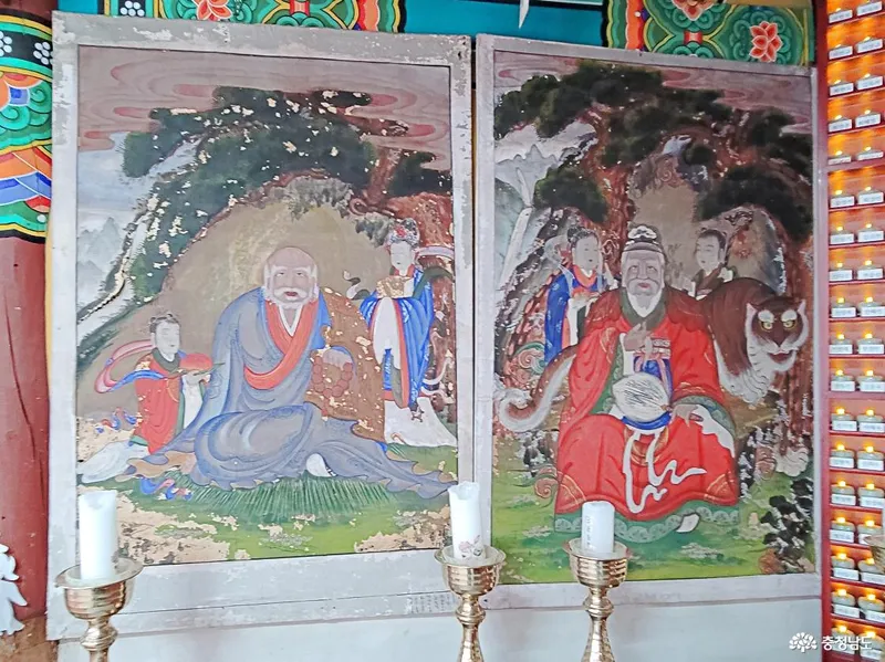 이와 함께 삼존불의 오른편으로 ‘칠성탱화’는 ‘치성광여래’를 중심으로 좌우에 ‘일광보살’과 ‘월광보살’이 협시하고, 상단에 자미대제와 남극노인성 등 칠여래를, 하단에 칠원성군을 그려 넣었습니다. 함께 걸인 독성탱화과 산신탱화는 비교적 최근인 1970년 대 제작된 것으로 알려져 있습니다.