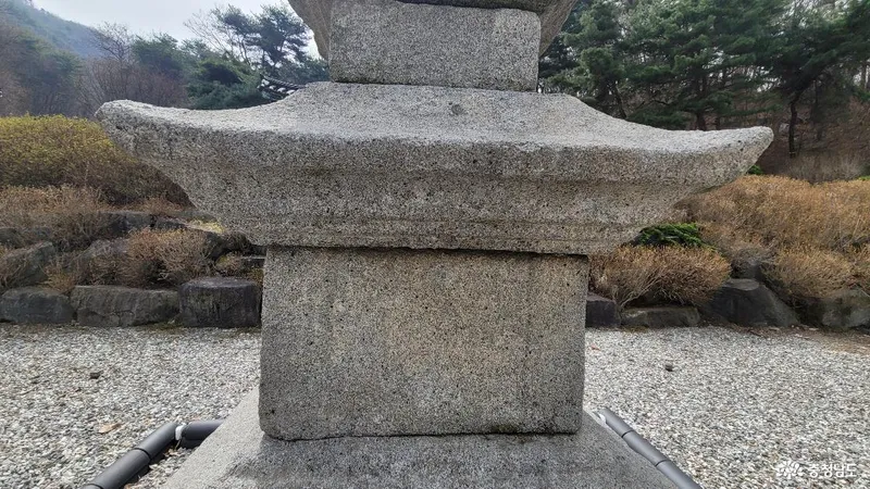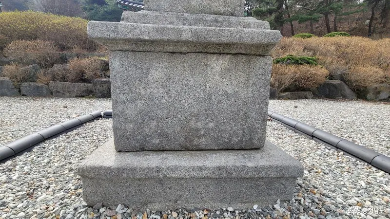 석탑의 명문은 문화재 지정을 위해 2010년 조사 과정에서 발견됐습니다. 탑을 조성하면서 자체에 명문을 새긴 경우도 흔치 않은데, 상층기단 갑석 윗면에 이를 새겨놓은 것은 더욱 드문 사례였다고 합니다. 기단부는 지대석 없는 이중기단인데 하층기단은 저석, 면석, 갑석이 한 개의 돌로 조성되고 면석에 코끼리 눈을 표현한 ‘안상’ 두 개씩을 새겼습니다. 갑석 윗면에는 상층기단 받침을 낮게 돌출시켜 고려초 석탑의 특징을 보여줍니다. 상층기단도 기단석과 갑석을 한 개의 돌로 만들고 기단석에 우주(귀기둥)와 탱주(버팀기둥)을 새겼는데 탑신 받침의 아래로부터 '낮고 둥글게 ⇒ 각지게 ⇒ 둥글게 ⇒ 둥글게 ⇒ 아주 낮고 각지게' 등 5단의 섬세한 돌출과 그 안쪽의 글씨가 특징입니다.
