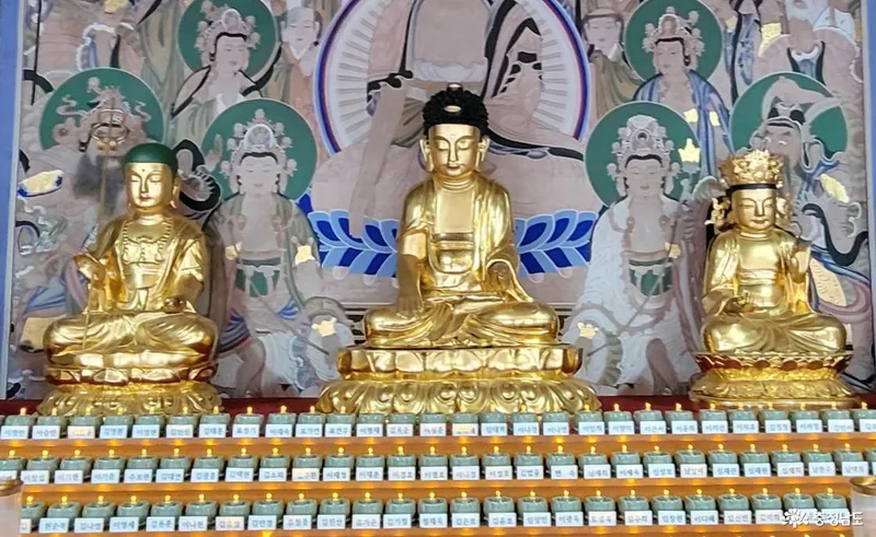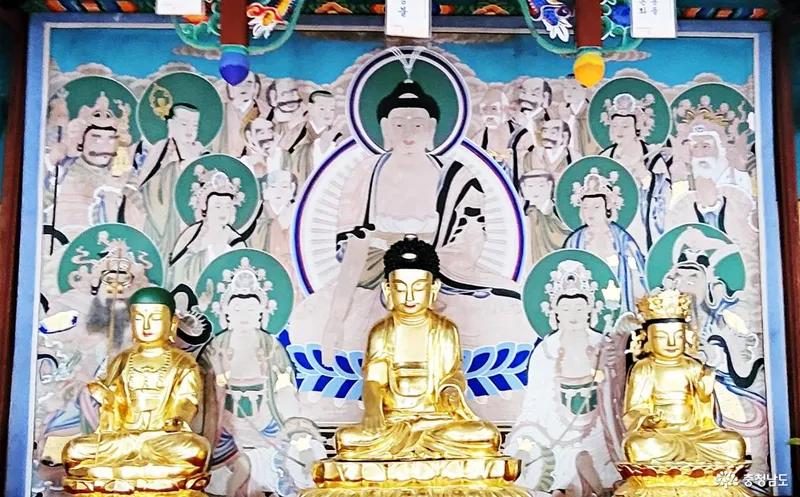 대웅전 상단 불단에는 석가모니불을 중심으로 오른편 지장보살, 왼편의 관세음보살이 협시하는 삼존불이 봉안되어 있습니다. 이들 불상은 조선후기 것으로 추정됩니다. 석가모니불의 왼손은 엄지와 중지를 맞대고, 오른손은 풀어 오른쪽 무릎에 얹은 채 손가락은 땅을 가르키는 항마촉지인(석가모니가 수행을 방해하는 모든 악마를 항복시킨 것을 상징) 수인(부처의 수인은 충남의 전통사찰 6. 인취사편 참조)을 하고 있습니다. 오른편 지장보살은 오른손에 지혜를 상징하는 육환장(六環杖. 고리가 여섯 개 달린 지팡이)을, 왼손은 여의주로 불리는 지혜의 마니주(摩尼珠)를 갖고 있는 모습입니다.