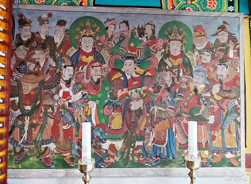 호법신중을 모셔 두는 ‘신중단(神衆檀)’의 ‘신중탱화’는 ‘동진보살’을 가운데로 위쪽에 ‘제석’과 ‘대범천’을, 상단에 ‘천신’을 나머지 여백에 ‘금강신장’을 배치했습니다. 신중은 불교가 지역별 토속신을 수용하면서 만들어진 것의 하나로 제석천·범천·사천왕을 비롯해 팔대금강신중과 야차·아수라와 같은 팔부신중 등을 모시는 공간입니다. 통상 ‘삼단불단’이라고 해서 부처나 보살을 모신 것을 ‘상단’, 신중을 모신 단을 ‘중단’, 일반 망자의 영혼은 ‘하단’으로 구분하는데 신중이 신앙의 직접적인 대상인 경우는 드물다고 합니다. 다만, 상단에 불공 이후 신중단에 ‘반야심경’을 독송하는데 이는 신중이 부처를 돕고 중생을 돌보는 것의 감사표시라고 합니다.